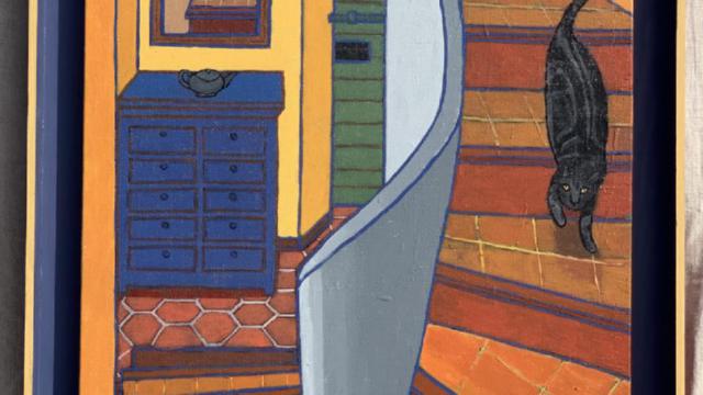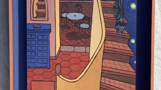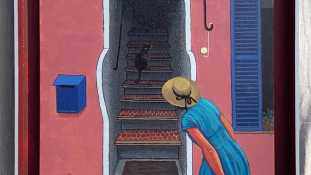 Chat dans l'escalier, acrylique sur toile, 59x75cm encadré, 2025