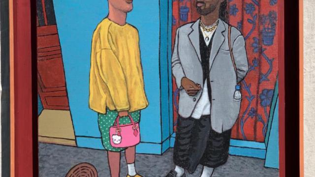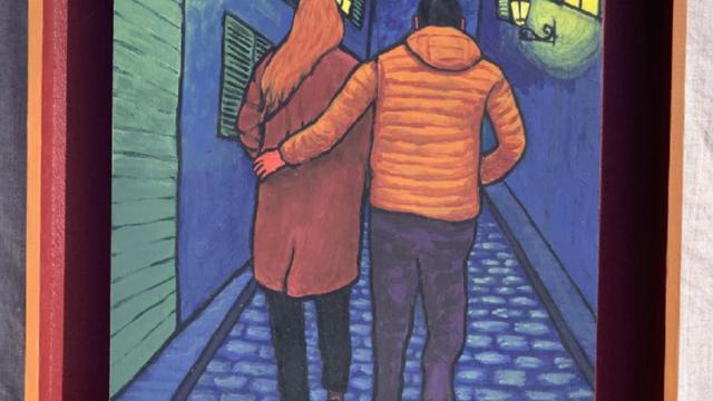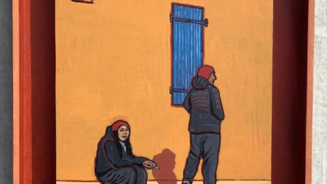Couple au bonnet rouge, acrylique sur papier marouflé, 39x51cm encadré, 2025
