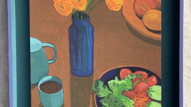 Table avec fleurs, acrylique sur papier marouflé, 39x51cm encadré, 2025