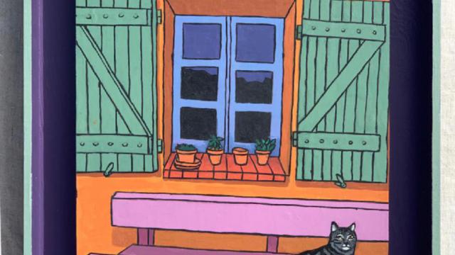 Chat à la porte, acrylique sur papier marouflé, 39x51cm encadré, 2025. Collection privée.