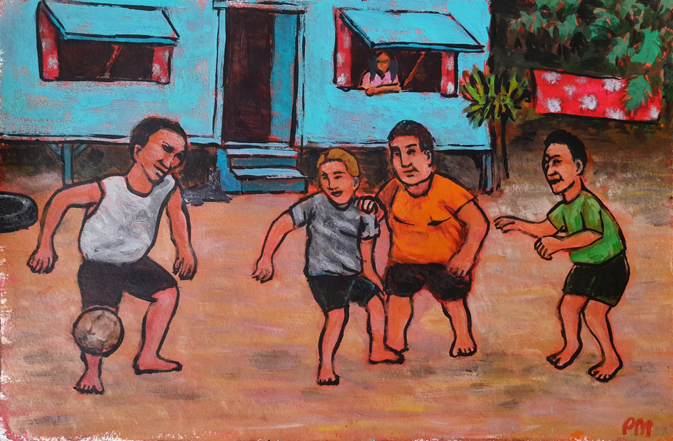 C’est Julien, le seul popa’a pur jus de la bande qui amenait le ballon. Un vrai de vrai en cuir. Au début, il avait essayé de convaincre les autres de le laisser jouer avec ses crampons mais devant le refus général, il s’était résolu à jouer pieds nus comme tout le monde.