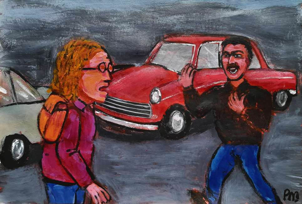Le conducteur a alors ouvert sa portière et s’est dirigé vers Julien. "Tu fais du stop ou tu te branles?", à craché le mec, sorti de nulle part. Julien était pris de court. Il voyait cet adulte avancer à grands pas vers lui. A Tahiti, il faisait un peu de boxe avec les potes dans le jardin mais là, c’était une autre paire de manches! Sentant l’inévitable, il a ôté ses lunettes (à l’époque il portait des petites lunettes rondes à la John Lennon, et la même coupe de cheveux) et les a fourré dans la poche de son parka. Lorsque le gars à franchi la zone de sécurité, Julien lui a décoché une gauche fulgurante au menton. Le gars s’est retrouvé le cul sur la chaussée en une fraction de seconde. Sonné mais pas KO. Deux autres gars sont sortis de la voiture et là, Julien a senti monter l’adrénaline. Ils étaient déjà trop près pour s’enfuir. D’un geste il a retiré son parka, un peu empêtré dans son cartable sac à dos. Près à vendre cher sa peau.
