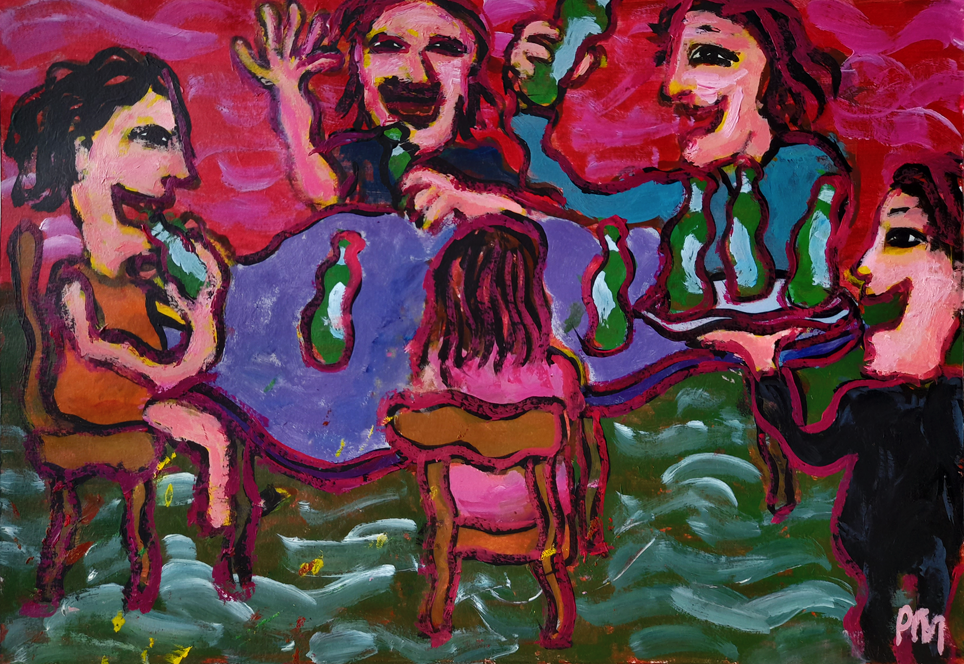 Le serveur s’est retourné, genre WTF (bien que l’expression n’existait pas encore). Sony m’a donné un coup de pied sous la table. « On va y aller », il a dit. On a réglé l’addition et on est sorti. Moi, je rigolais nerveusement. C’est pas que la table qui ondulait, c’était tout le décors! Personnages compris.