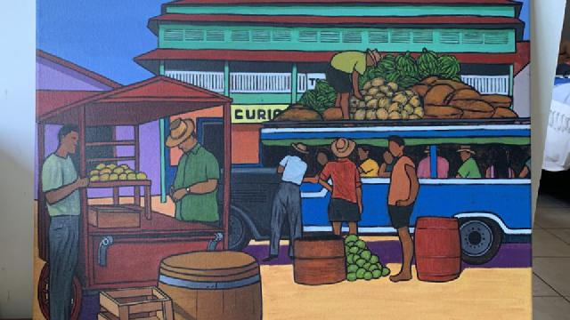 Le déchargement du truck à Papeete dans les années 60. Acrylique sur toile, 65 x 50 cm, 2024. Collection privée.