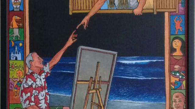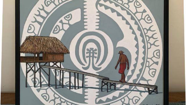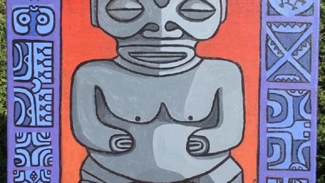 « Tiki 'ā'ata » (le tiki rieur) Acrylique sur toile 50x61cm 2024. Gauguin Awards, décembre 2024. 3e place. Collection privée.