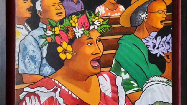 Feia Himene (Chœur d'église). 2022. Acrylique sur toile. 50 x 50 cm. Encadré caisse américaine 60 x 60 cm. Collection privée.