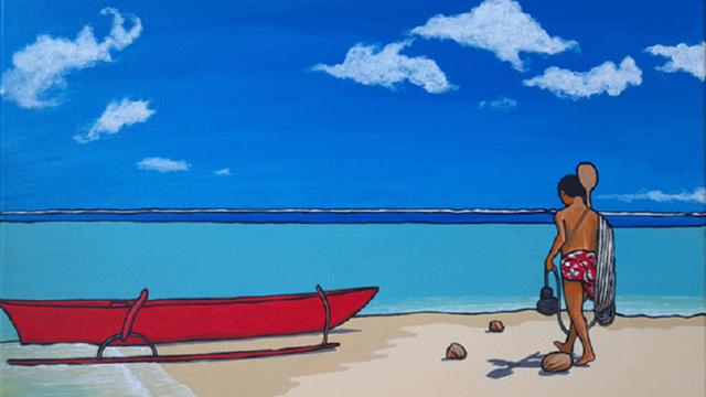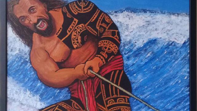 Maui pêchant les îles de Polynésie. 2020. Acrylique sur toile, 50 x 65 cm. Collection privée.