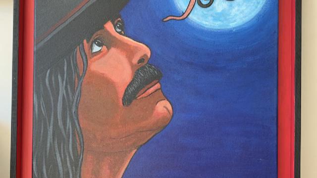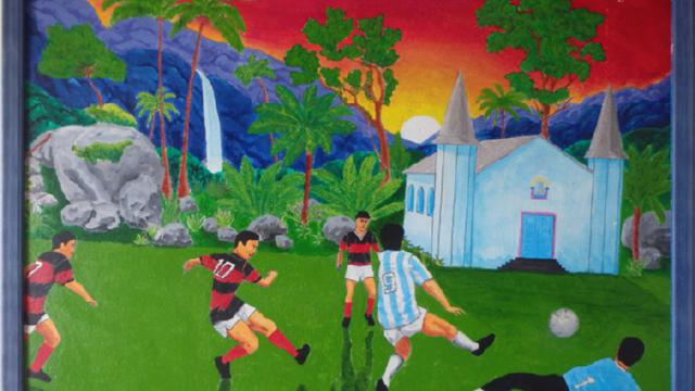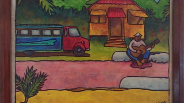 Guitariste au bord de la route. 1979. Acrylique sur contreplaqué, 30 x 40 cm. Collection privée.