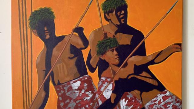 « Lanceurs de javelots » Acrylique sur toile, 60 x 60 cm. 2e aux Gauguin Awards de juillet 2024. Collection privée.