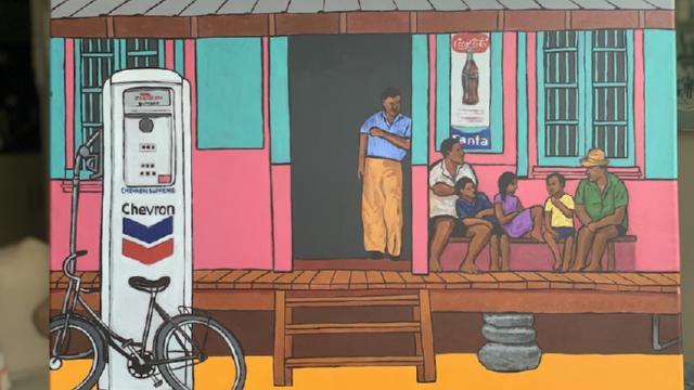 « La station, pour nous, est un coin de rendez-vous » Acrylique sur toile, 50 x 70 cm 2024. 6e place aux Gauguin Awards de juin 2024. Collection privée.